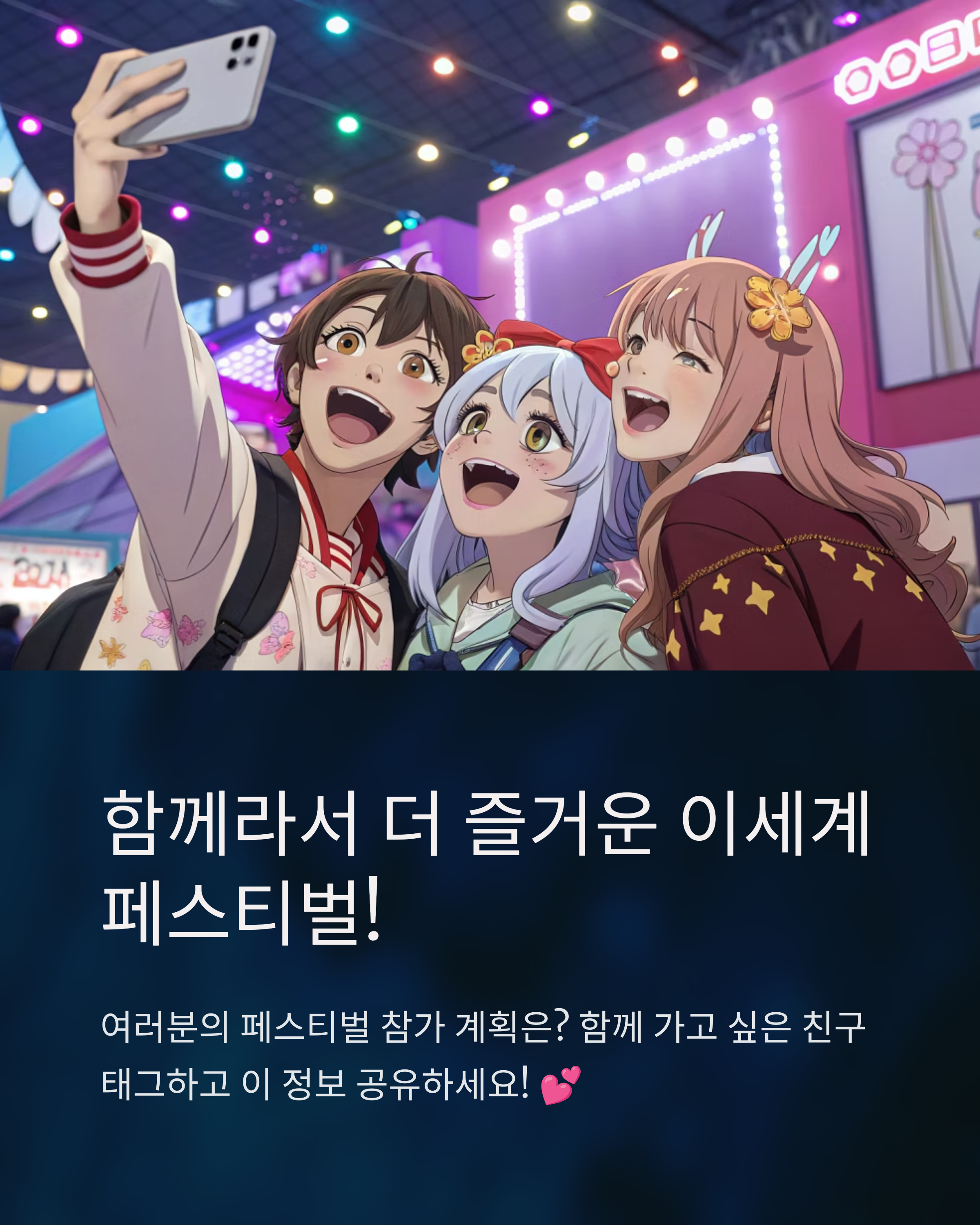 이세계 페스티벌은 단순한 행사가 아니라, 팬들이 1년을 기다려 모이는 성지 그 자체입니다. 이번에도 예매는 전쟁이 될 거고, 라인업은 말 그대로 ‘이세계급’이죠. 아직 시간이 있다고 방심하지 마세요! 사전 준비 철저히 하고, 친구들과 함께 작전 짜서 도전한다면 여러분도 이번엔 꼭 입장 성공할 수 있을 거예요. 이세페에서 만나요! 🌟