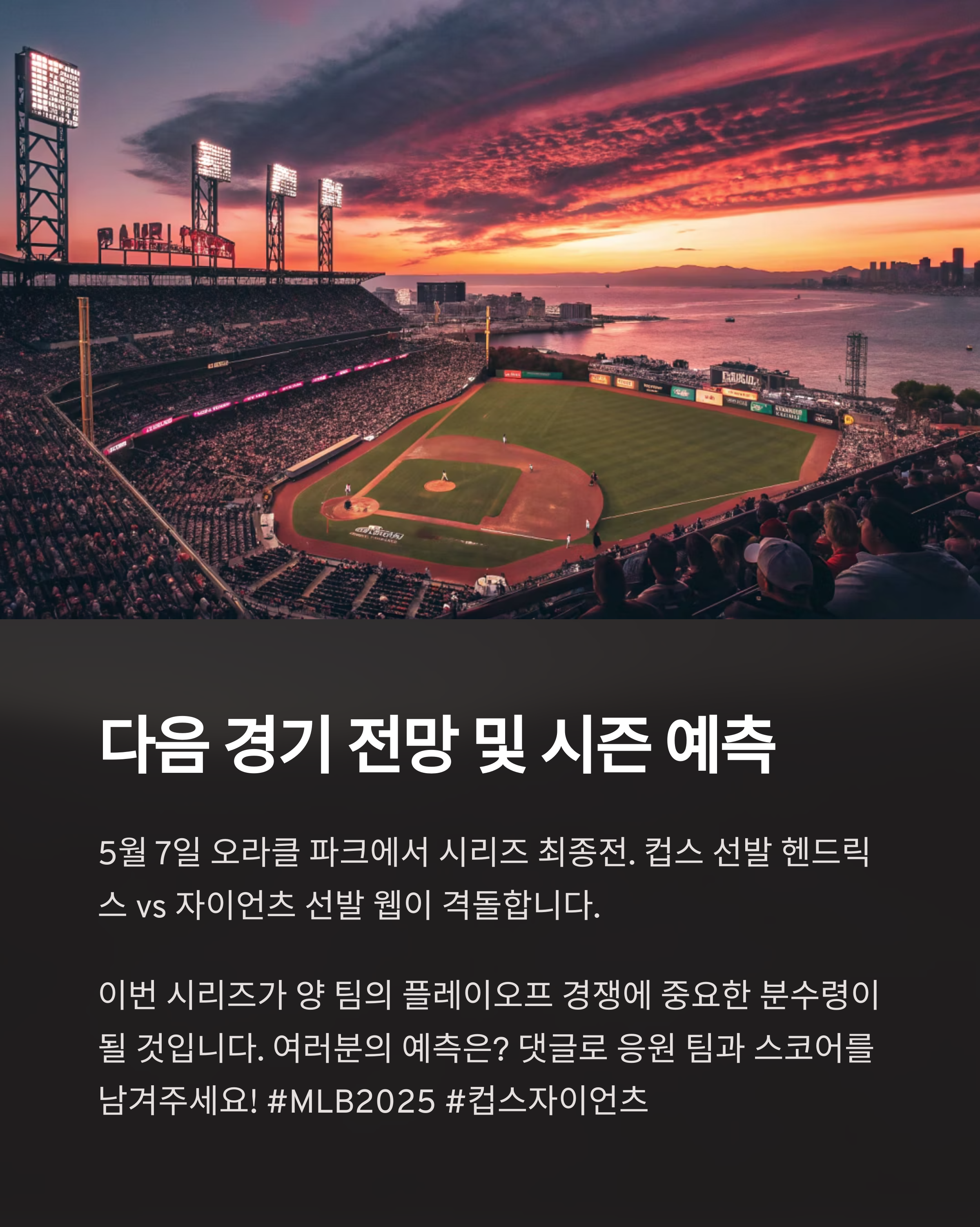 오늘 포스팅에서는 2025년 5월 5일 펼쳐진 컵스 대 자이언츠 경기를 중심으로 MLB 최신 트렌드와 데이터를 분석해봤습니다. 야구 팬이라면 놓치기 아쉬운 한 판이었죠! 앞으로도 이런 흥미로운 경기와 통계, 그리고 시즌 흐름에 대한 이야기를 계속해서 전해드릴 예정이니, 자주 들러 주세요. 다음 글에서는 자이언츠의 로테이션 변화와 컵스의 포스트시즌 전략을 다뤄볼게요!