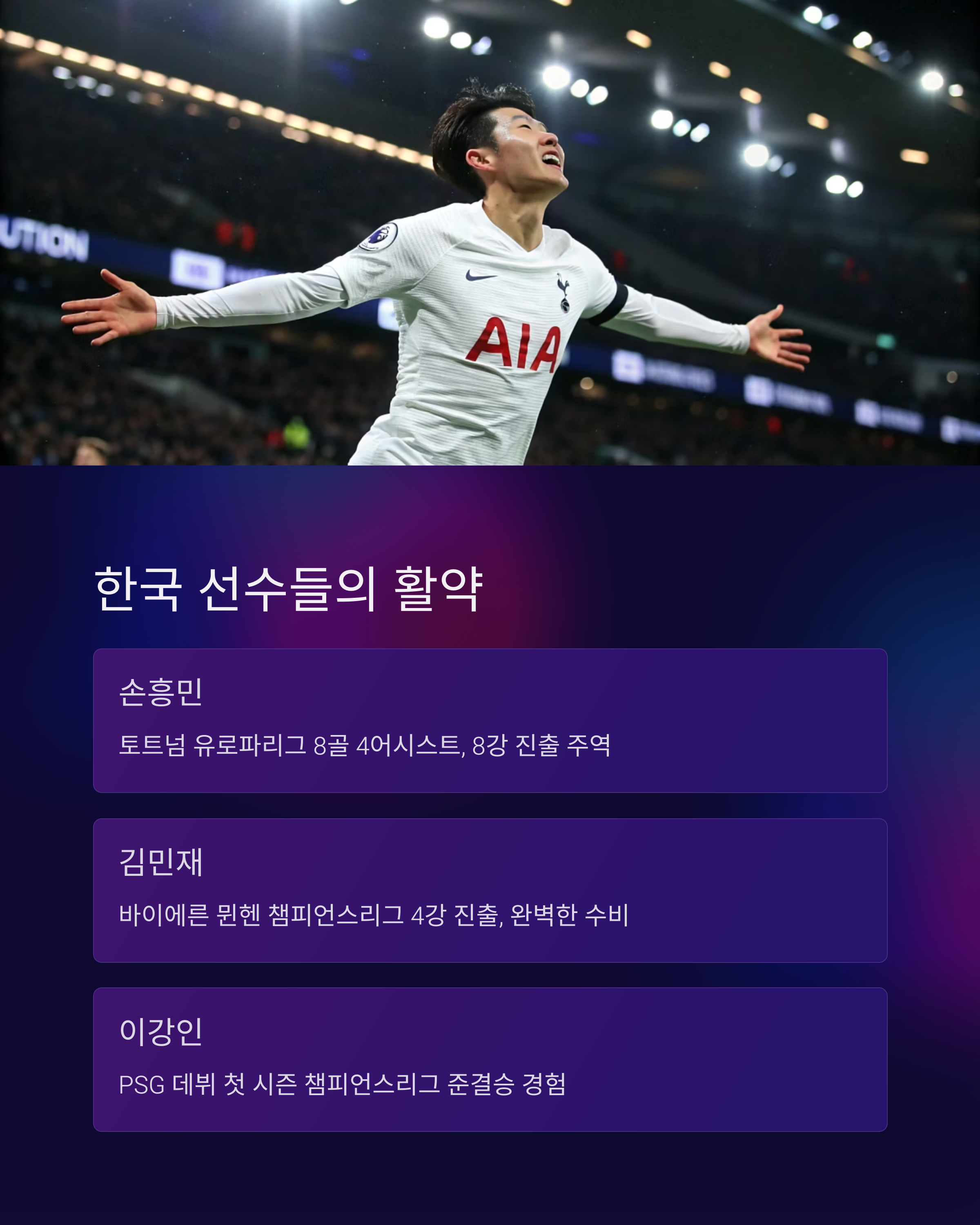 트위터, 인스타그램, 레딧 등 SNS는 이번 챔스와 유로파 얘기로 불타올랐습니다. 특히 손흥민, 김민재, 이강인의 활약에 대한 국내 팬들의 반응도 뜨거웠어요. 아래는 올 시즌 팬 반응을 정리한 포인트입니다.