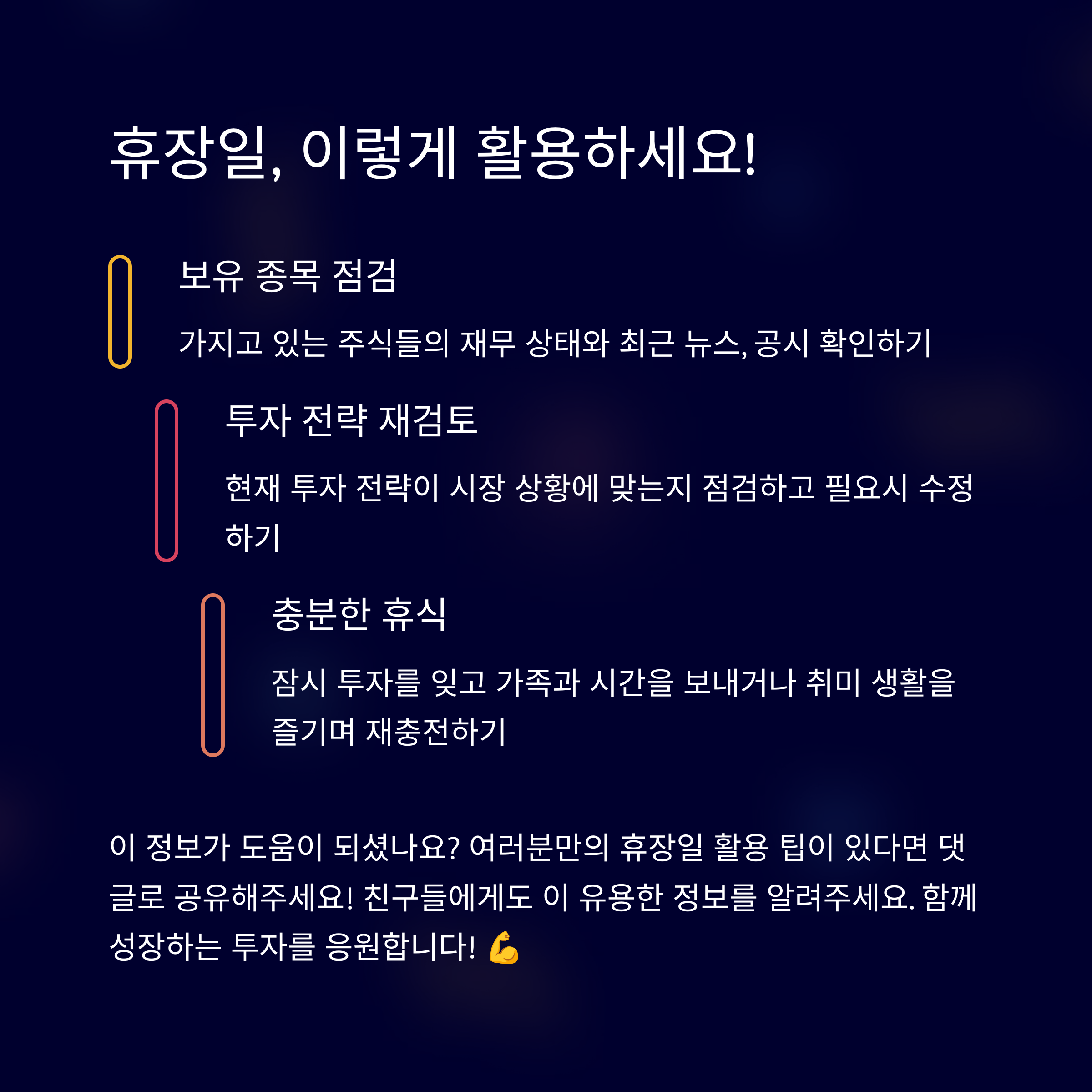 3. 투자자 체크리스트: 휴장일을 이용해 보유/관심 종목 점검, 투자 전략 재검토, 경제 지표 학습, 그리고 가장 중요한 휴식 시간을 갖는 것이 좋아요!