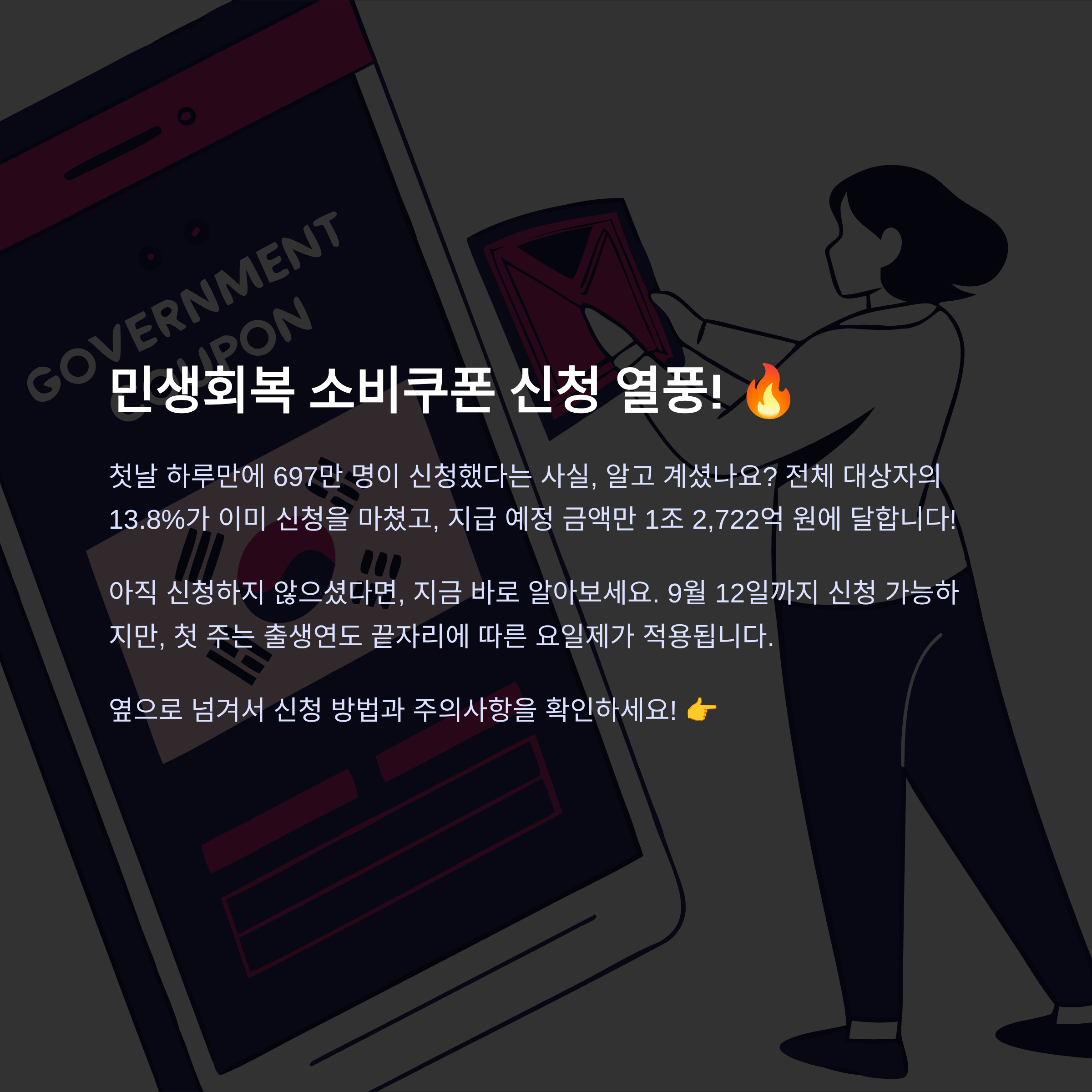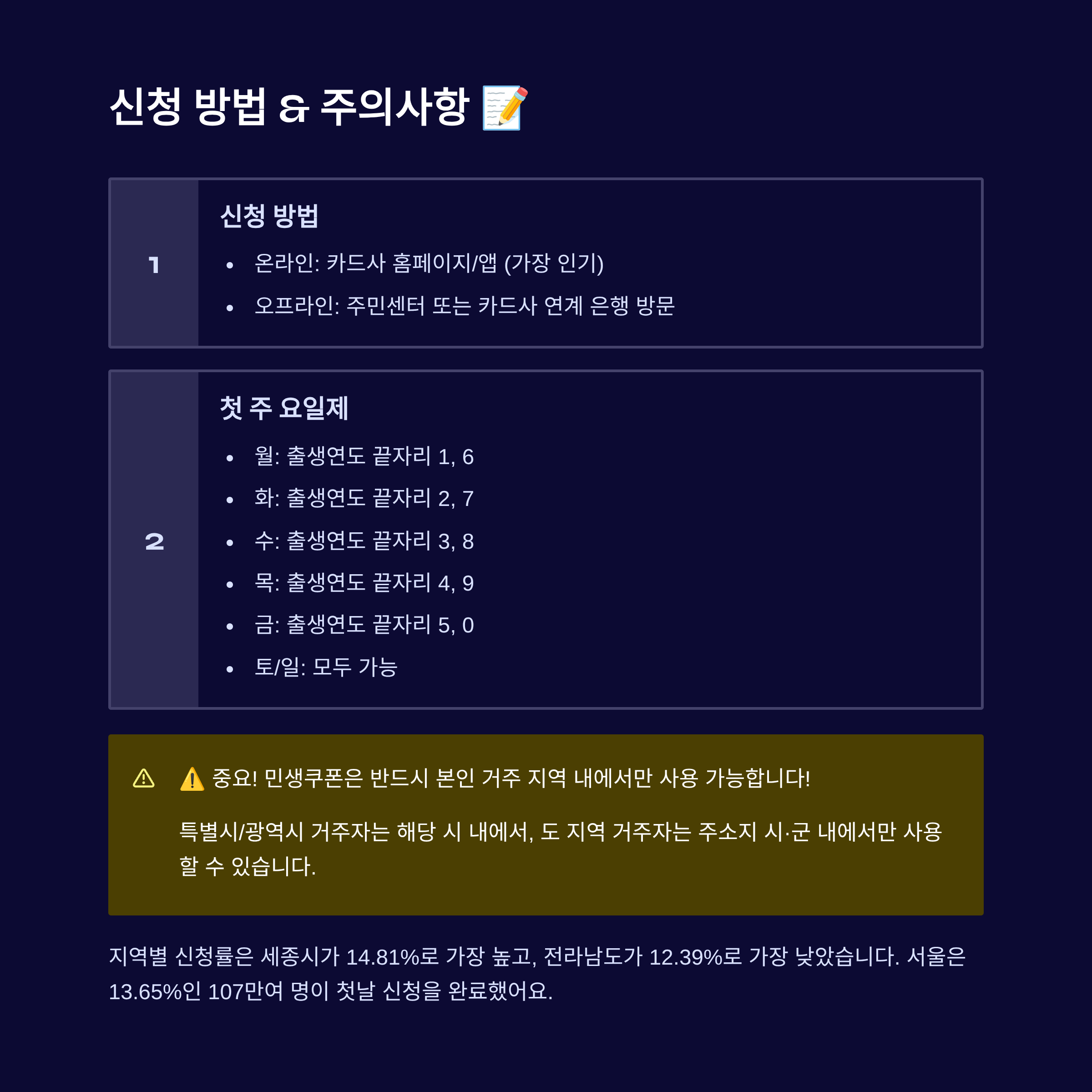 신청 첫 주(7월 21일~27일)에는 혼잡을 막기 위해 출생연도 끝자리에 따른 요일제가 시행돼요. 아직 신청 전이라면 내 출생연도에 맞는 요일을 꼭 확인하고 신청하세요!