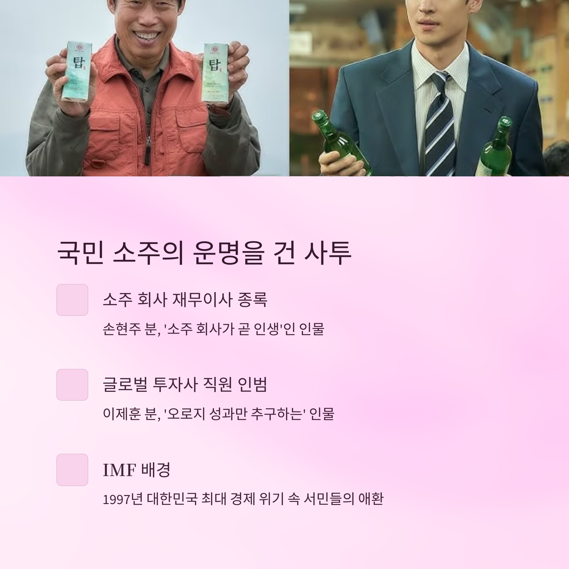 - 키워드: IMF, 소주, 경제 위기, 인간 드라마, 대립과 투쟁