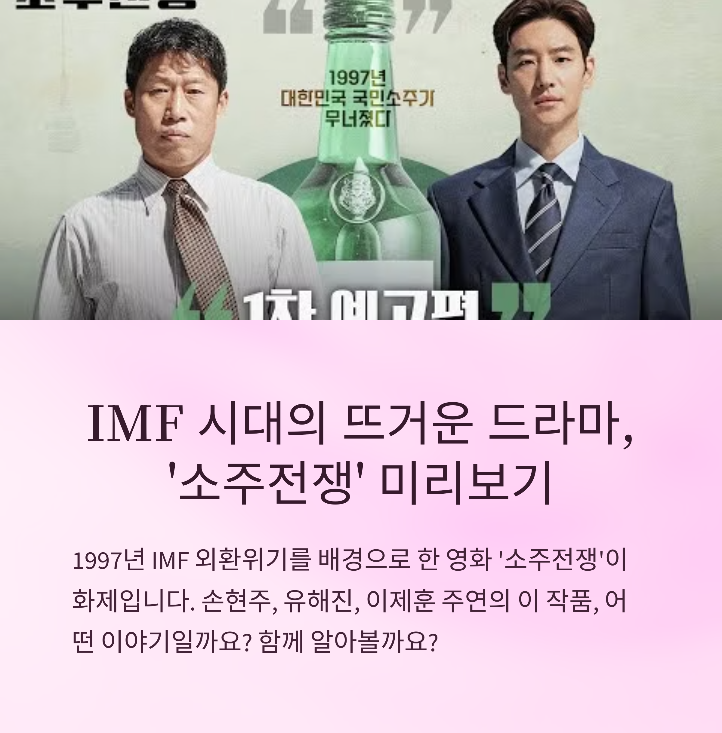 개인적으로 IMF 외환위기라는 배경 자체가 주는 무게감과 '국민 소주'라는 키워드가 만나 어떤 이야기를 풀어낼지 너무 궁금했어요. 1997년, 그 격동의 시간을 살아낸 많은 분들께는 향수를, 그 시대를 경험하지 못한 세대에게는 새로운 시각을 선사할 것 같은데요. 저도 그때의 분위기를 어렴풋이 기억하는데, 영화가 어떻게 그려낼지 기대가 됩니다!