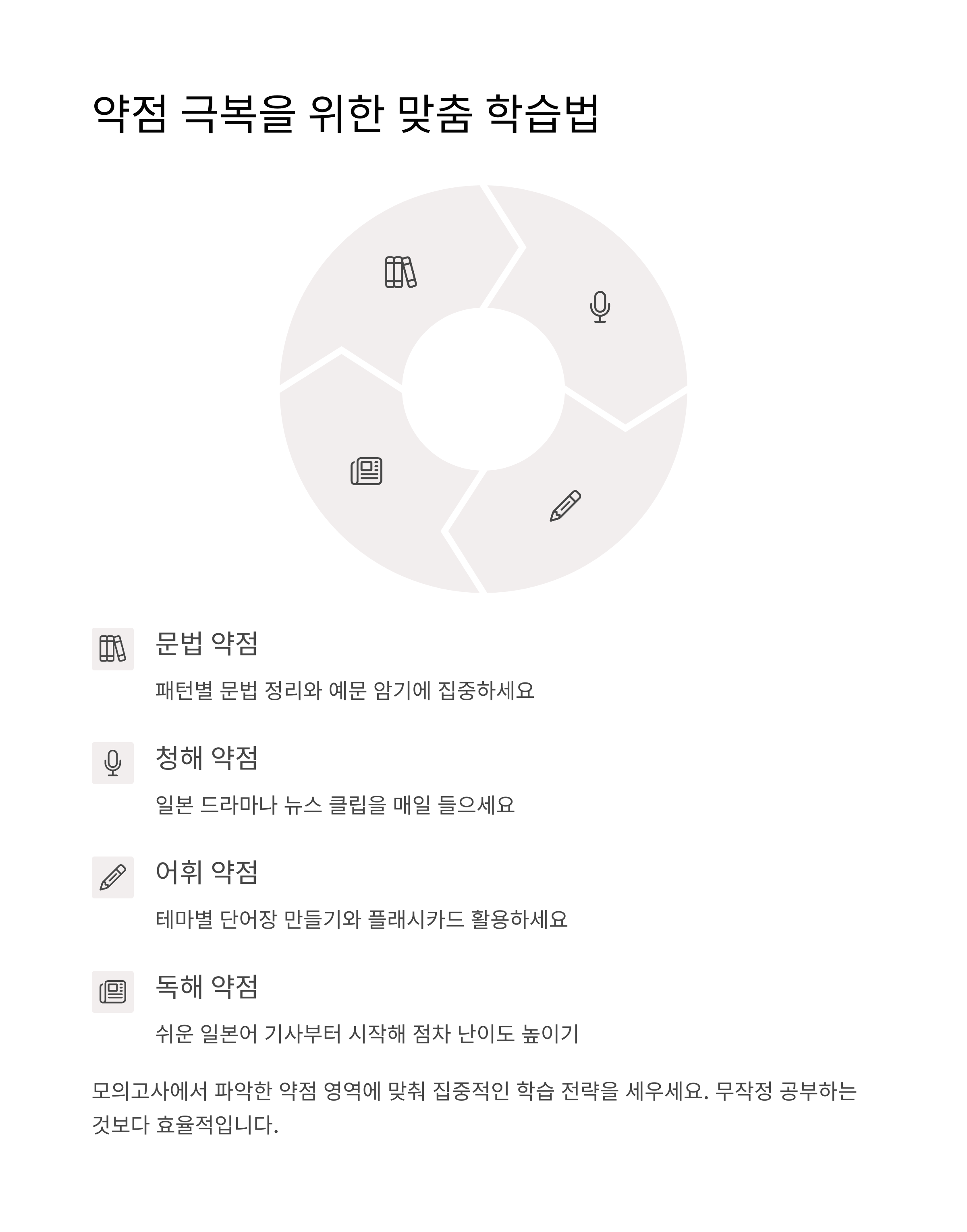 약점 파악 자신이 부족한 파트를 명확하게 확인하고, 그에 맞는 보완 학습이 가능해집니다.