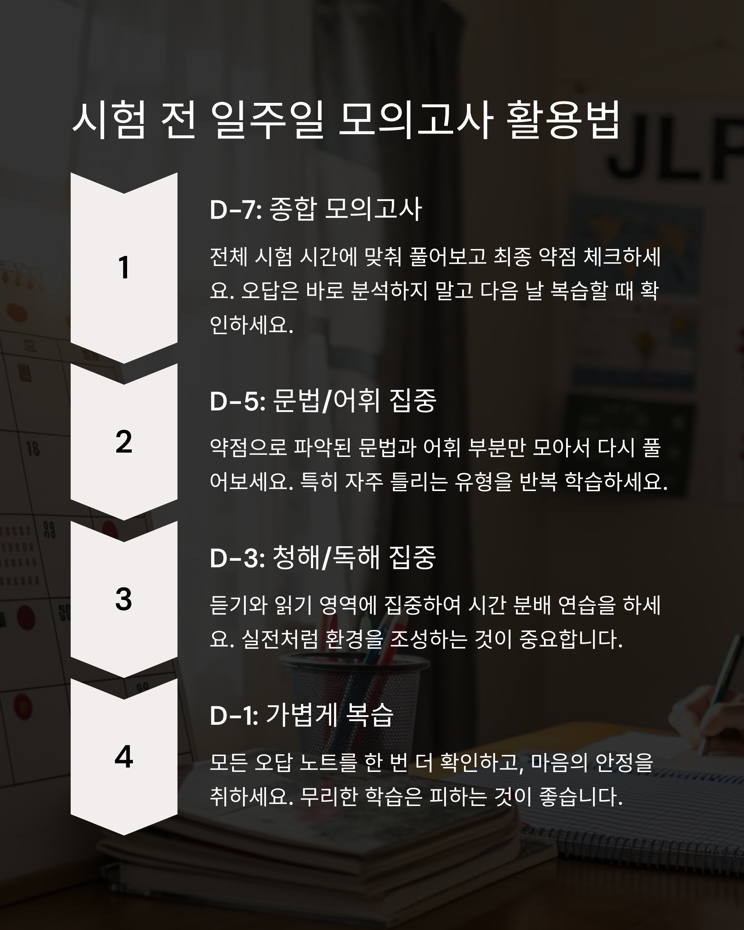 N3 시험 전 일주일은 가장 중요한 시기예요. 괜히 불안해서 이것저것 건드리기보단, 전략적으로 접근해보세요!