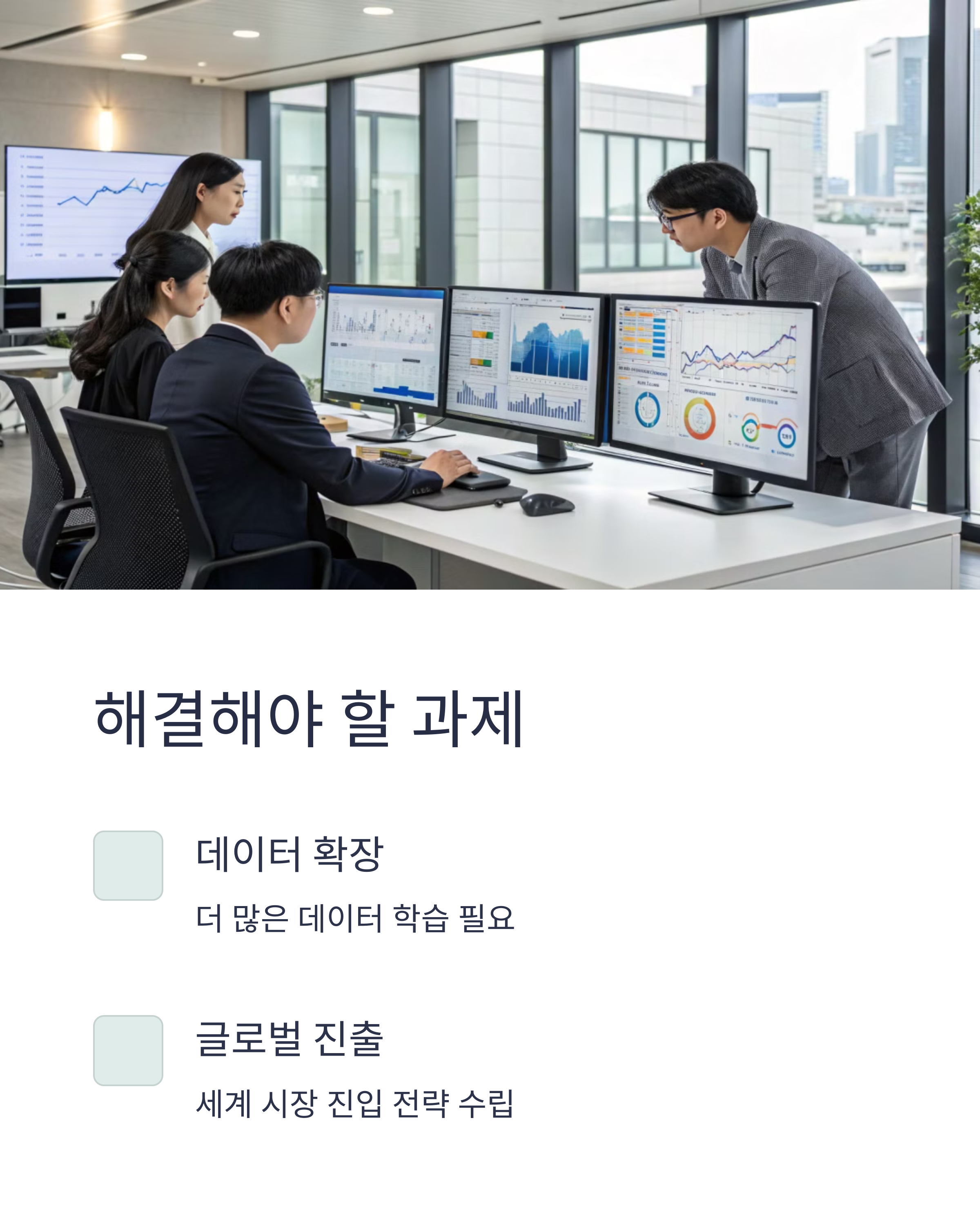 더 많은 데이터 학습, 인프라 확장, 글로벌 시장 진출, AI 윤리 문제 해결 등의 과제가 있습니다.