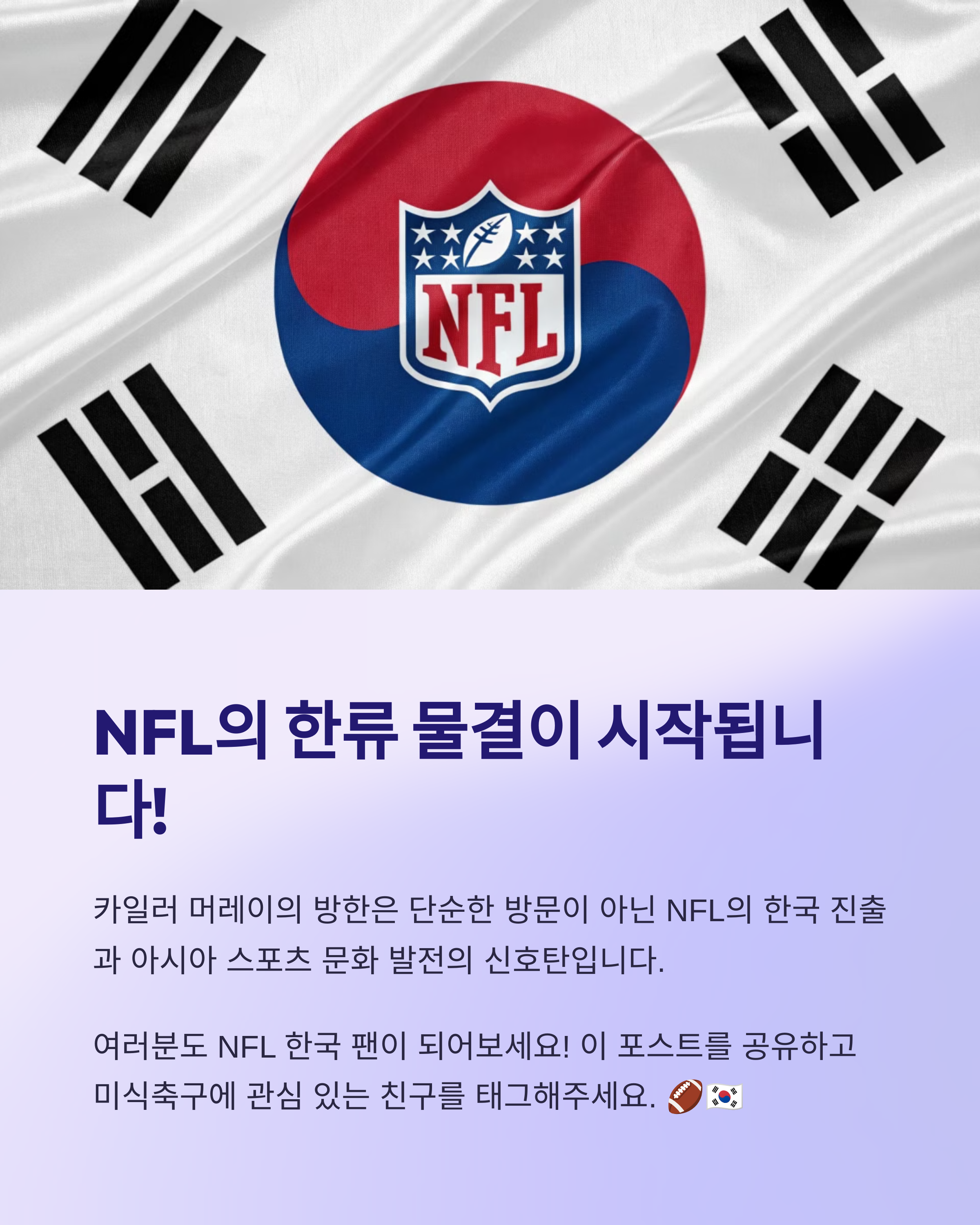 카일러 머레이의 방한은 단순한 팬서비스를 넘어, NFL의 ‘한류 확장’ 가능성까지 보여주는 시사점이 큽니다. K-콘텐츠의 세계적 영향력에 힘입어 미국 스포츠도 한국 시장을 주목하고 있으며, 머레이처럼 한국계 스타의 등장은 국내 팬들의 관심을 끌기 충분하죠.