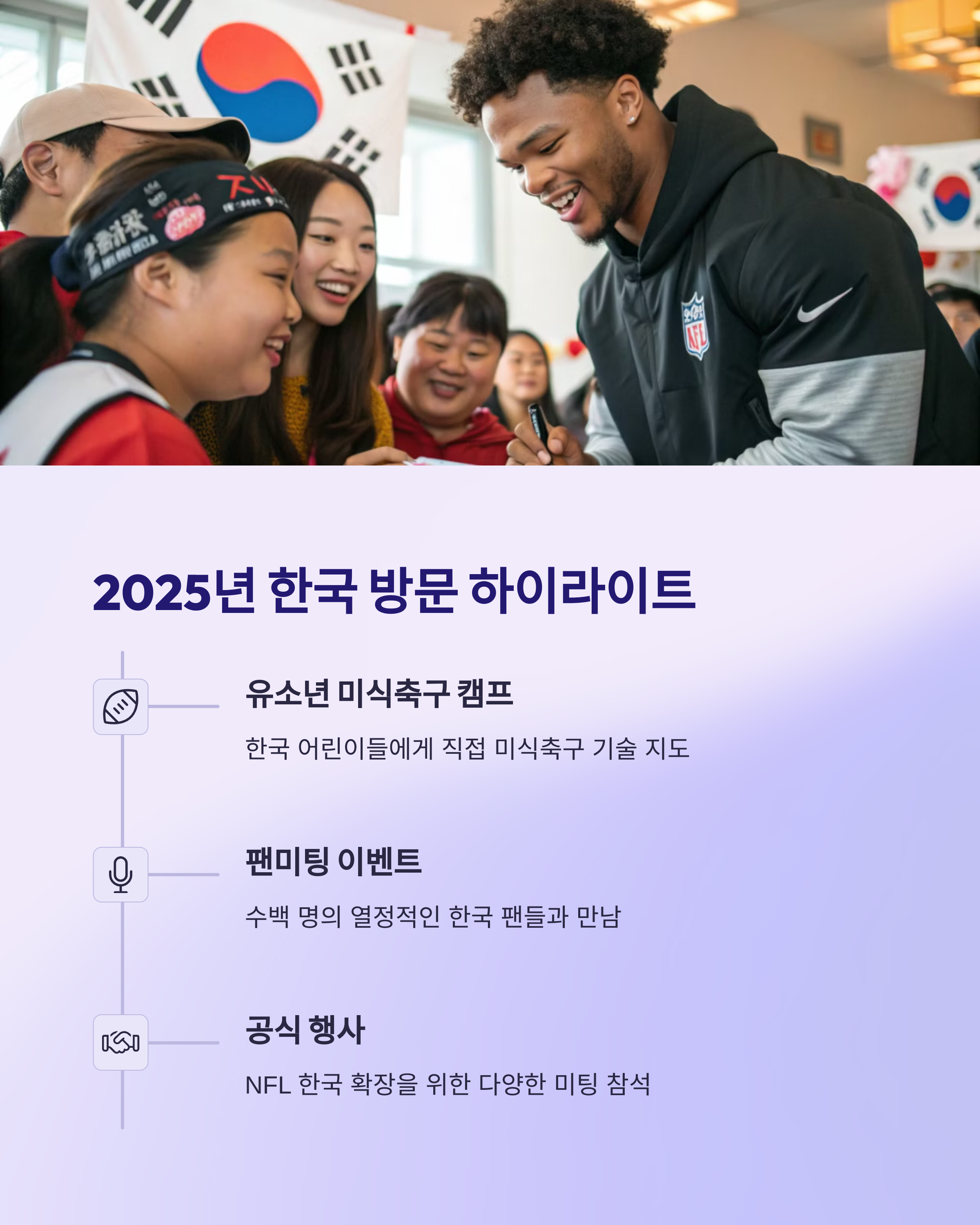 네, 팬미팅 및 유소년 미식축구 행사 등 다양한 공식 일정이 포함된 방문이었으며, 스포츠계와 미디어의 뜨거운 관심을 받았습니다.