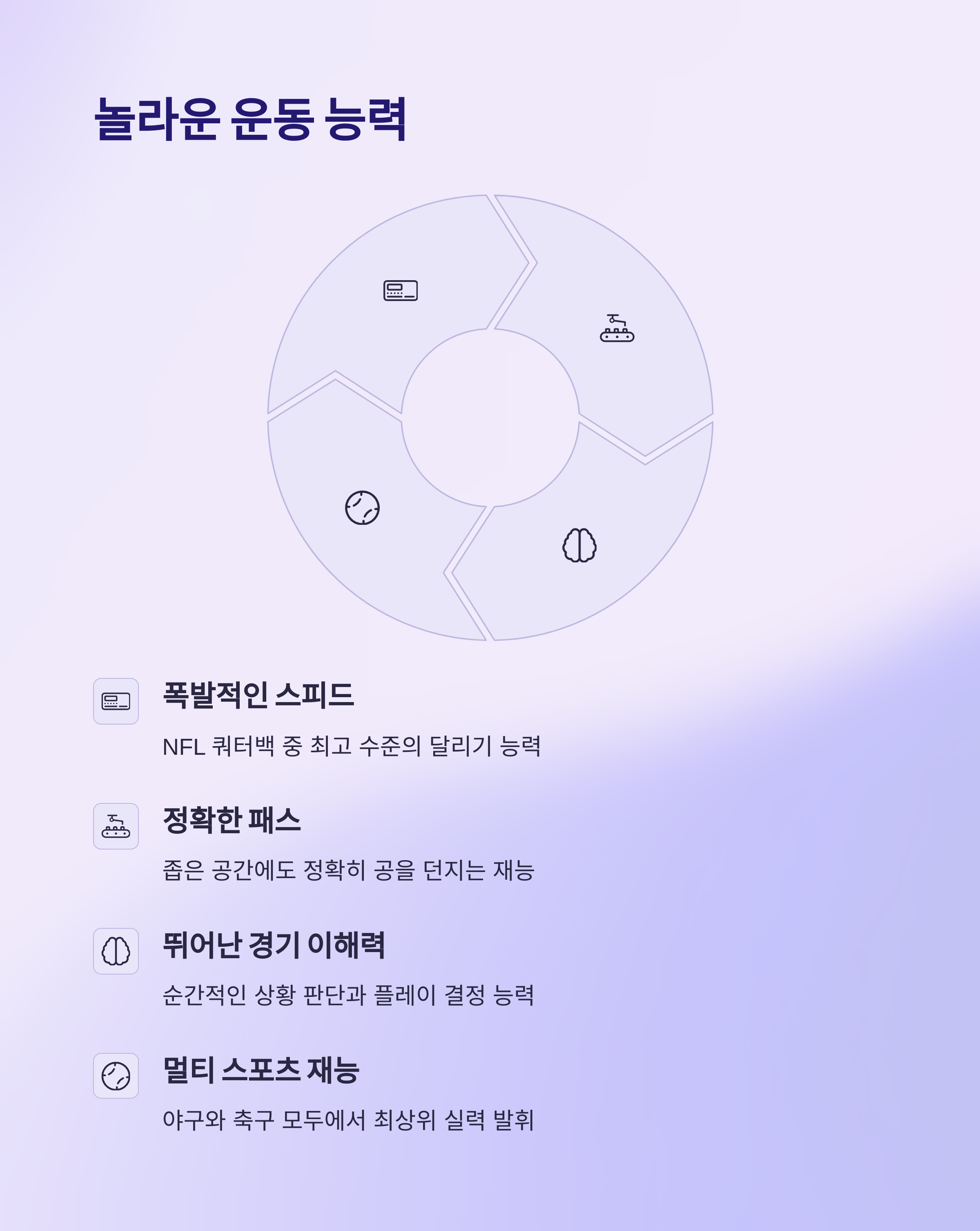 그는 NFL에서 쿼터백(Quarterback)으로 뛰고 있으며, 경기 운영과 패스, 러닝까지 맡는 핵심 포지션입니다.