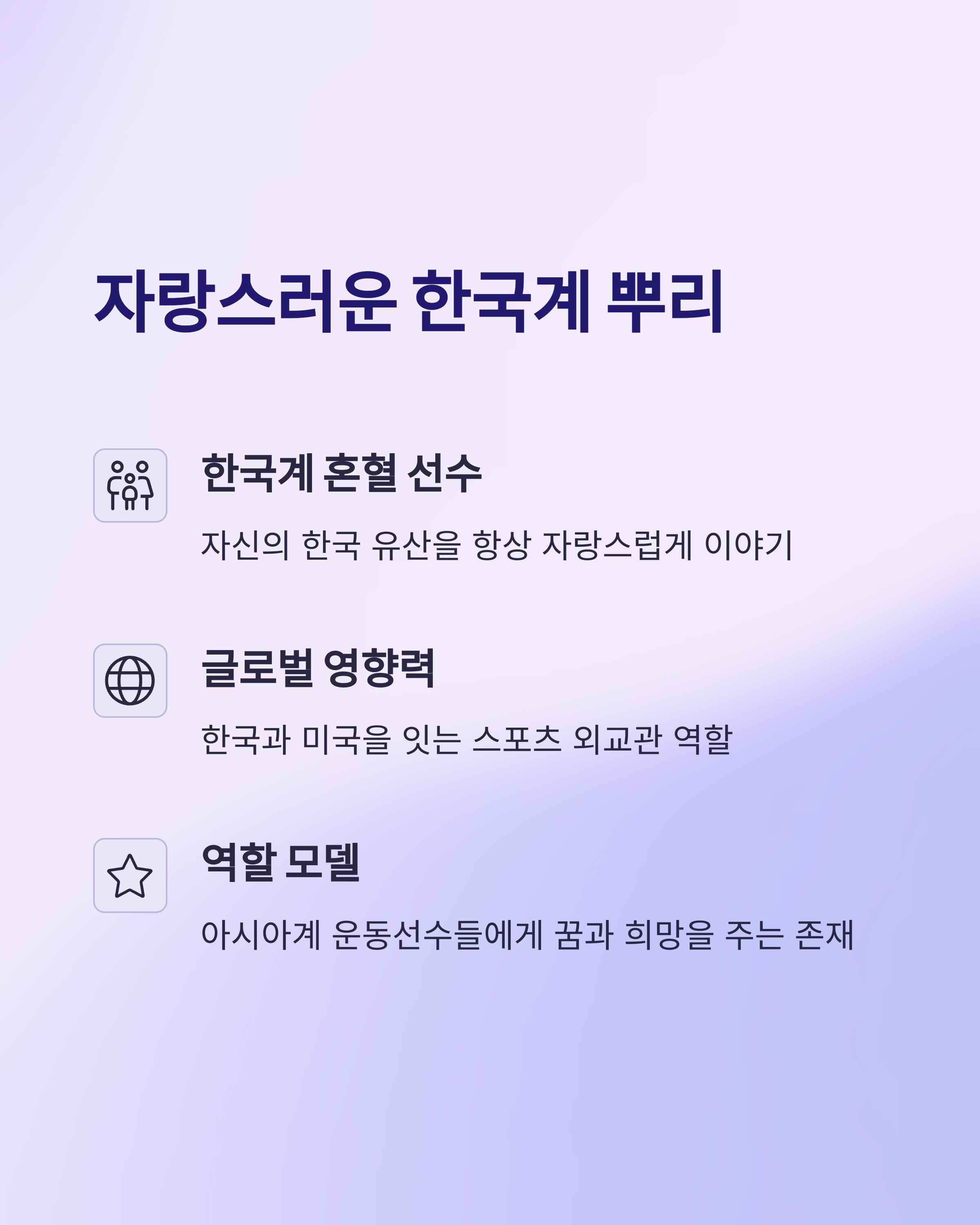 - 정체성: 인터뷰에서 “나는 한국 뿌리를 자랑스럽게 생각한다”고 밝힘