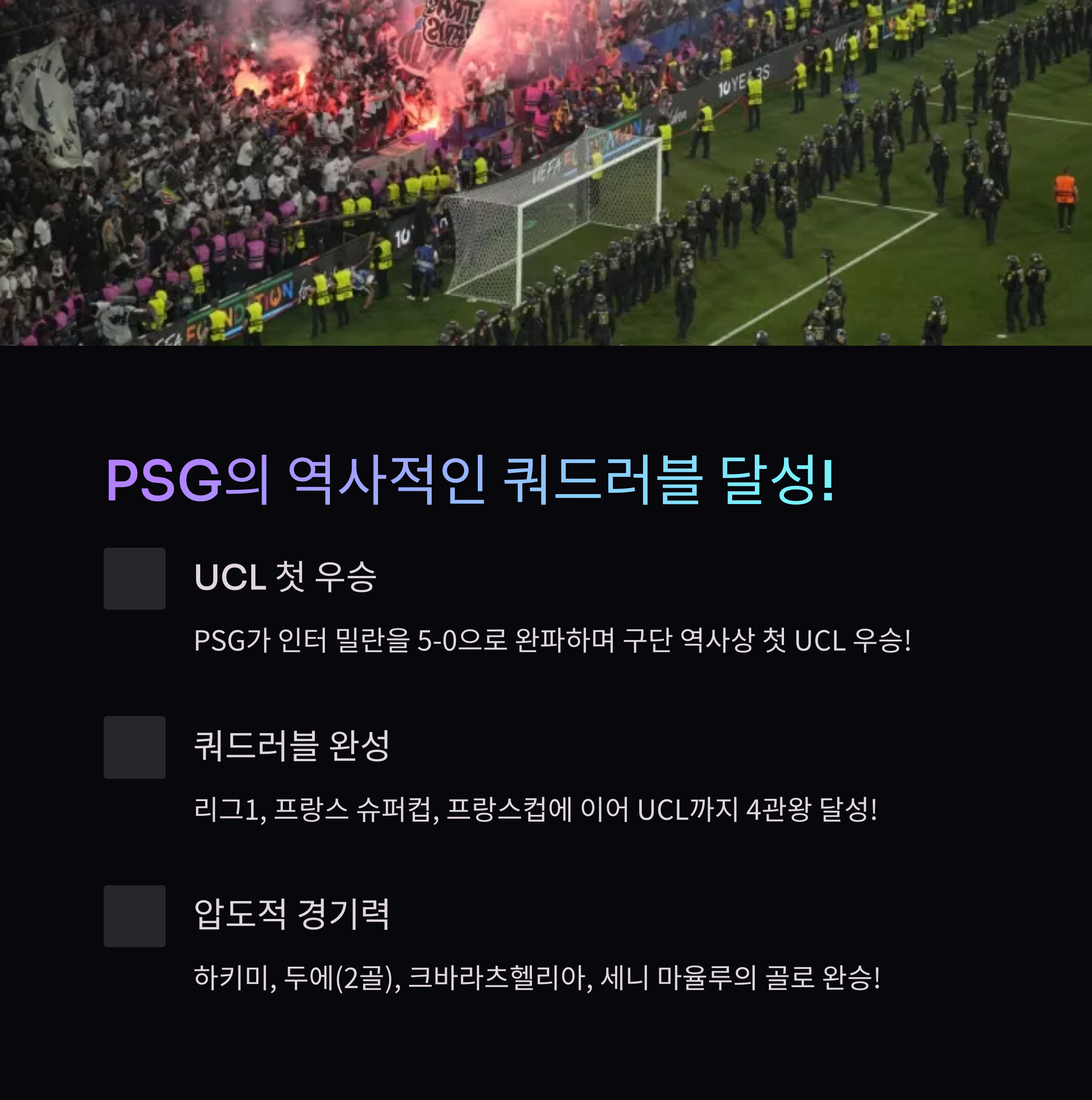- PSG UCL 첫 우승 & 쿼드러블: 파리 생제르맹이 인터 밀란을 5-0으로 꺾고 구단 역사상 첫 유럽 챔피언스리그 우승을 차지했습니다. 이로써 리그1, 프랑스 슈퍼컵, 프랑스컵에 이어 쿼드러블(4관왕)을 달성하는 기염을 토했습니다.